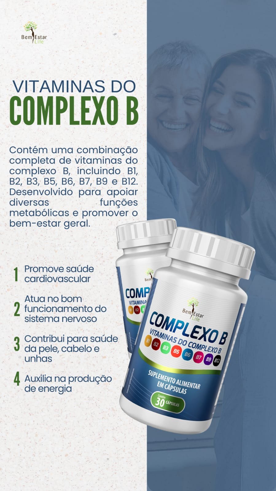 O Complexo B da Bem Estar Life combina vitaminas como biotina, acido pantotenico, acido fólico, vitamina B12 que apoiam seu metabolismo e o funcionamento do cérebro.